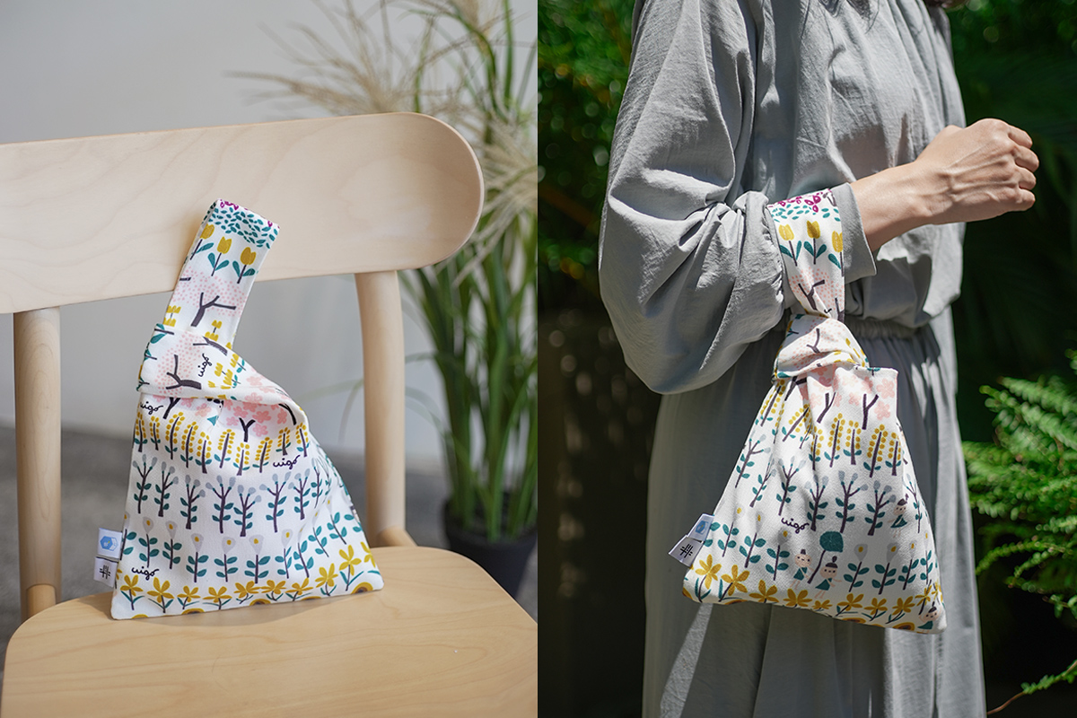 由於印花圖樣採橫向排列,隨機剪裁,楊子興認為最大的挑戰是,必須確保每塊裁下來的布縫起來都完美,因此花了許多時間模擬、試稿。每個小包都都獨一無二,正好也呼應了四季遞嬗、別具趣味的專屬感。