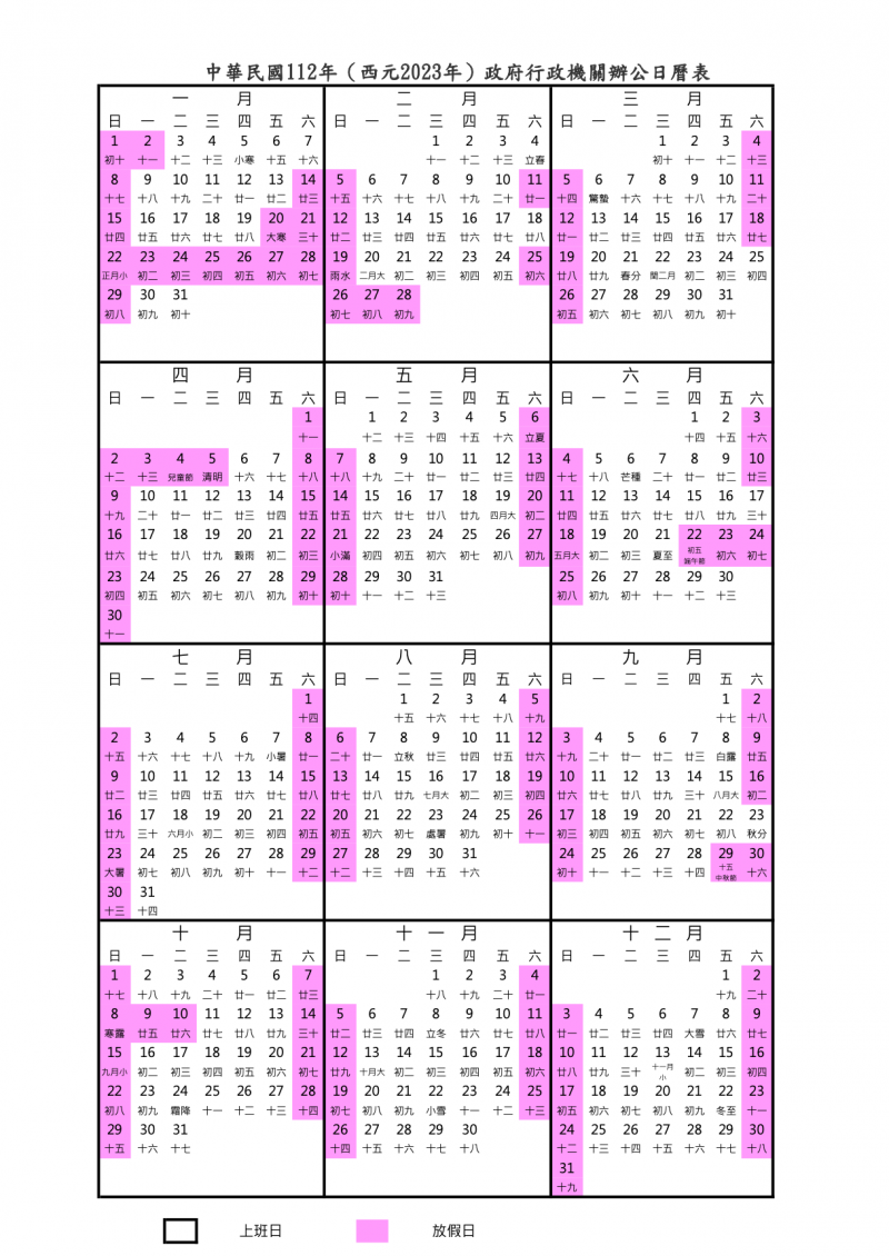 民國 112 年(西元 2023 年)行事曆出爐了!人事總處公布由行政院核定的「112 年政府行政機關辦公日曆表」,2023 年(民國 112 年)總放假日數為 116 日,超過 3 天的連假一共有 7 個,包含農曆春節假期 10 天、兒童節及民族掃墓節 5 天,而連休 4 天的假期則有 3 個。