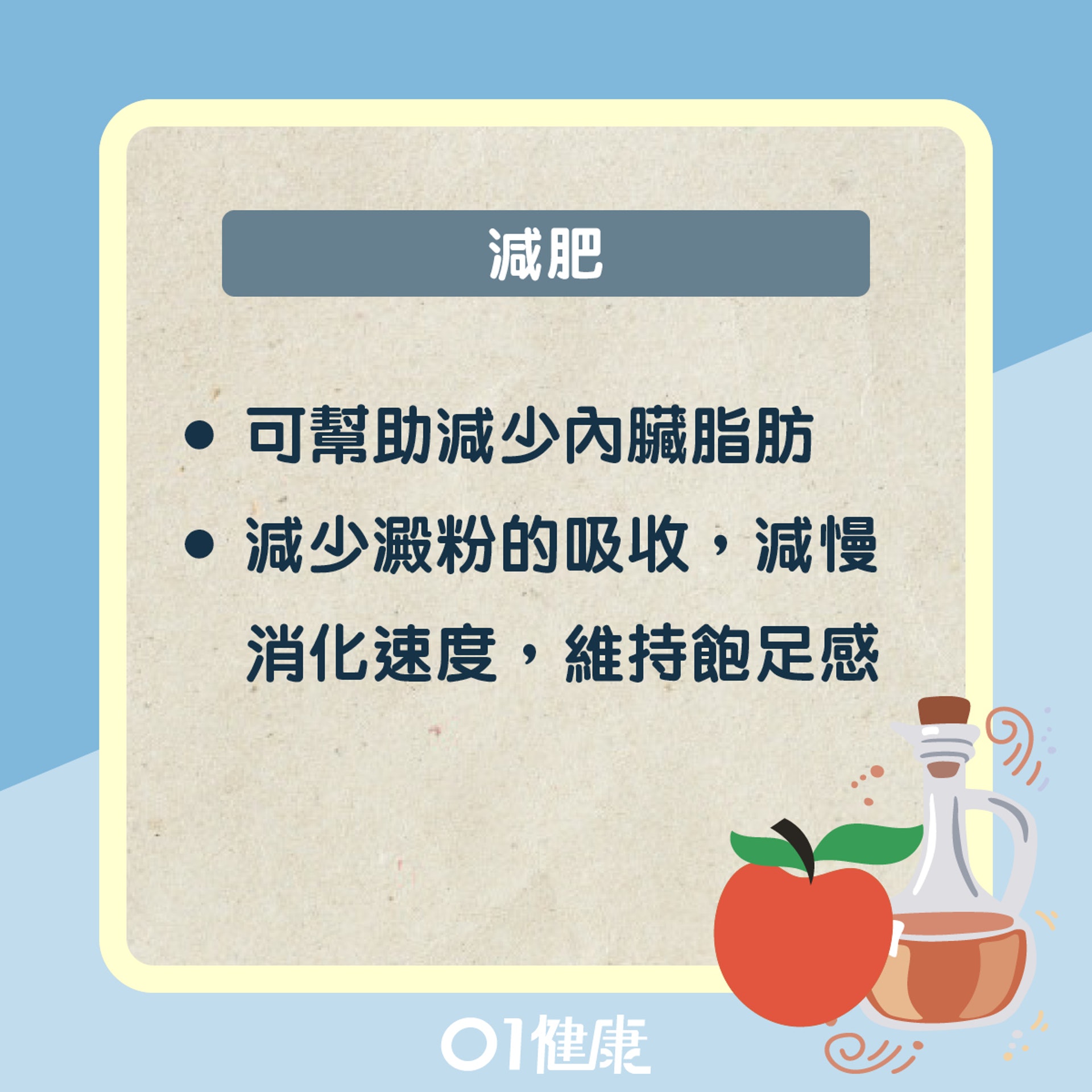 蘋果含豐富維他命 C、E、胡蘿蔔素、茄紅素、果膠等,不但能提升免疫力、抗氧化,還有助降膽固醇、預防腎結石等。而醋有助降血糖、防三高。若兩者結合成為蘋果醋功效又是否加倍?綜合《印度時報》、日本電視節目《林修の今でしょ!講座》報道,蘋果醋有 9 大好處,除了減肥,還可抗菌、降血糖等。