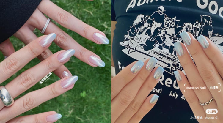 Y2K 的風潮尚未退燒,也連帶激起鏡面美甲款式的高人氣!若妳也想嘗試鏡面款式,同時從中創造俏皮感,便很推薦搭配銀色鏡面堆疊!除了透過漸層技巧創造暈染感之外,也可以適度留白、保留透膚感,會讓指尖視覺更加清爽有夏季感。