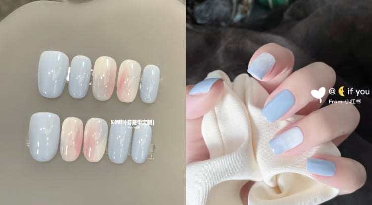 要強化手部造型的細節感,渲染款式是個不錯的選擇!粉嫩嫩的寶寶藍、粉紅肉桂色暈染上白色系,讓甲面色彩猶如晴朗的天空襯托棉花糖雲彩,柔軟又耐看!這時還可以搭配單色甲彩跳色呼應,工作場合、見家長也不失誤。