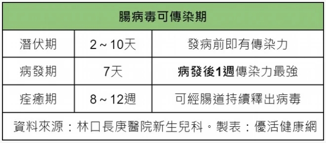 而腸病毒在發病前即有傳染力,潛伏期約 2~10 天;尤其是在病發期,發燒、喉嚨痛等症狀開始出現的當週,病毒傳染力為最高;即使病發痊癒後,病毒仍可存在於腸道或糞便中長達 2~3 個月之久,提醒爸媽在幫幼兒替換貼身衣物如內褲、尿布時,還是需要特別注意手部清潔,避免被傳染。