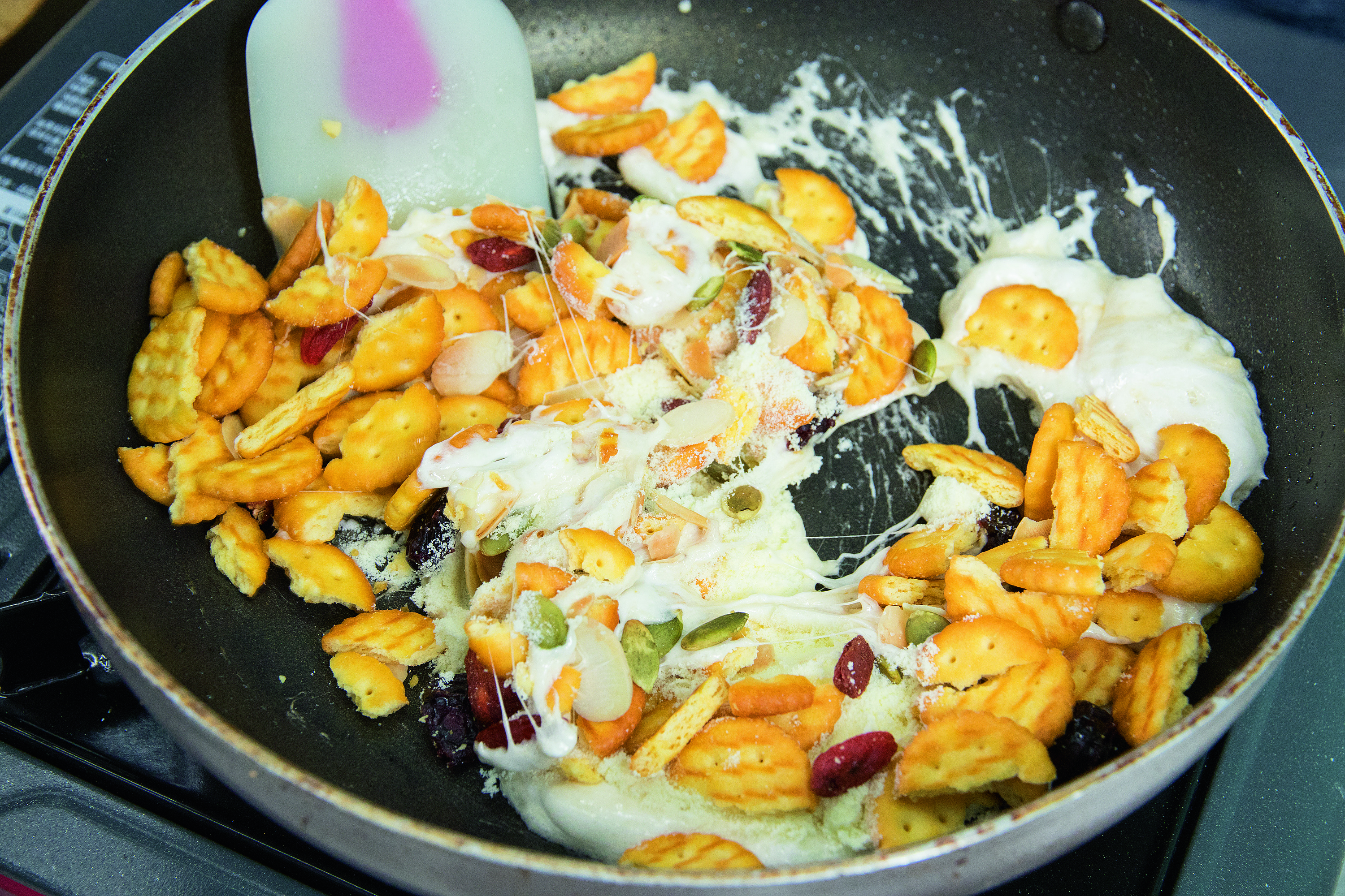2. 將奇福餅乾折半及堅果和蔓越莓乾及枸杞放烤箱,以 100 度保溫備用。〈延伸閱讀:居家手作甜點二三事:第一次親手烘焙就上癮!端出一盤盤經典餅乾滋味〉