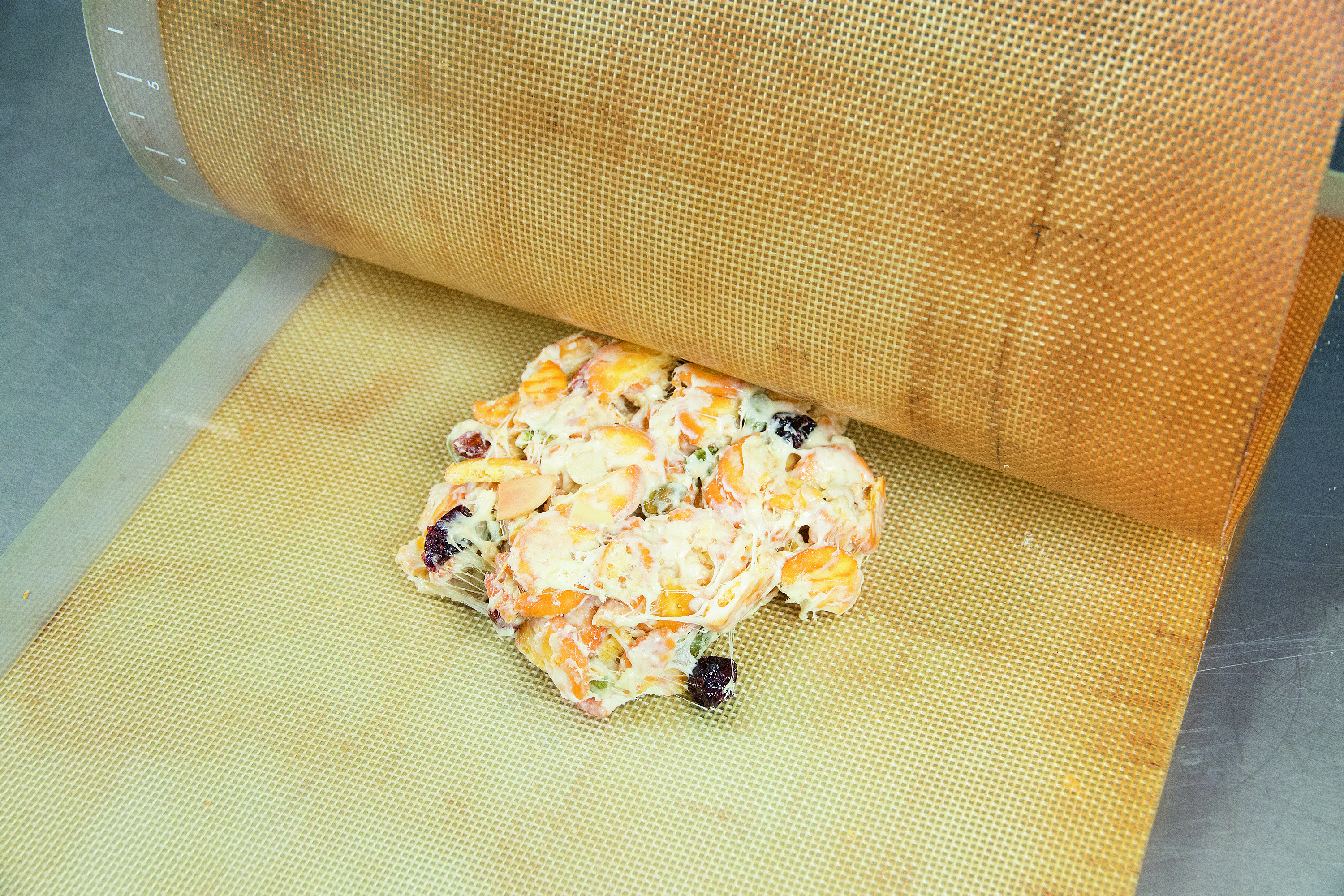 5. 倒入舖上烘焙布的烤盤中,蓋上另一張烤焙布,帶上手套將食材壓平,讓厚度平均約2公分厚。
