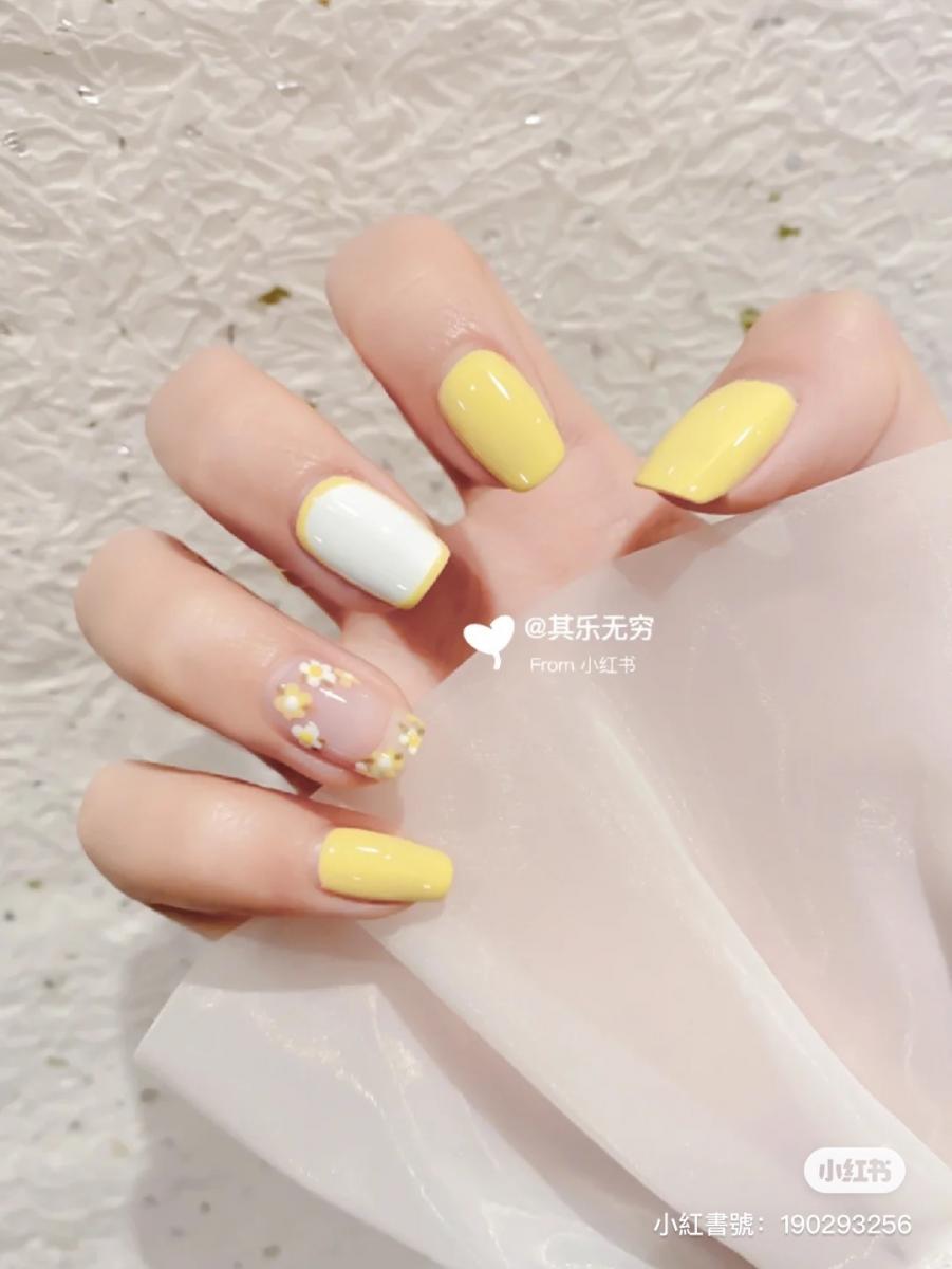 春夏怎麼能少了小花元素?花朵圖樣依舊是今年的重頭戲,而除了女孩最愛的粉色、紅色系花朵之外,奶油黃小花也很受歡迎~小花點綴於甲緣,搭配實色跳色做造型,妳還能發現今年美甲趨勢上也很盛行用色彩描繪指甲邊框,也別有一番簡約美感。〈延伸閱讀:不想老是花大錢做光療?小資女必收藏的 5 個指甲油品牌,隨心所欲幫指甲換新妝〉