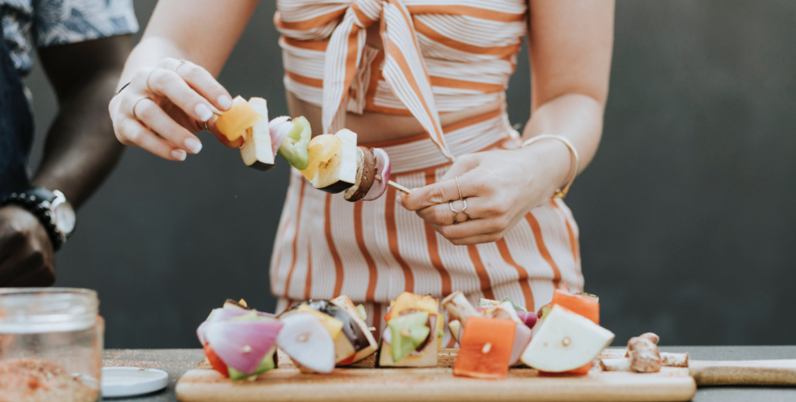 在燒烤過程,可用調味粉取代高鈉、高熱量的烤肉醬,除了可以品嘗食物新鮮原味之外,更能降低健康的負擔。最後可以多搭配蔬果,尤其像香菇、青椒、玉米筍、生菜、小黃瓜等蔬菜,除了體積大、熱量低,又富含纖維質,搭配肉類也比較清爽可口,且增加飽足感,可以相對減少肉類的攝取,讓烤肉既可增加美味又可減少負擔沒煩惱。