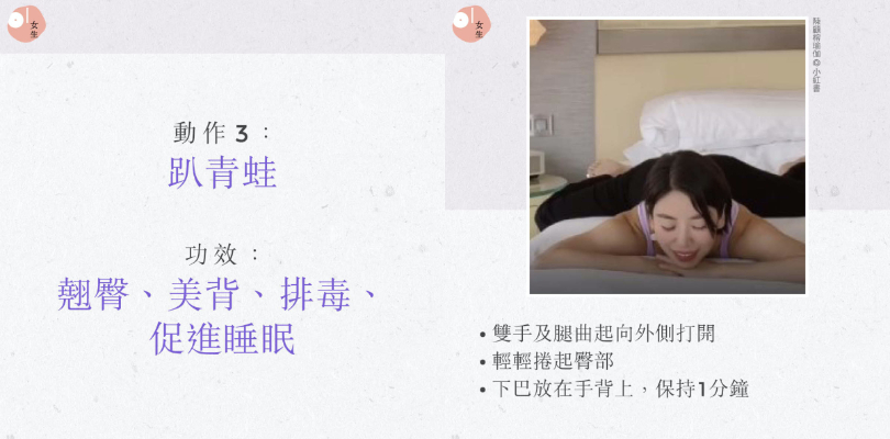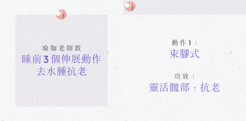 最近她分享一套非常簡單輕鬆的睡前伸展運動,3 個動作大約 5 分鐘便可完成,特別適合需要長時間站立、久坐不動而引起的小腿浮腫,亦有助排毒,抗老、舒緩背部及美臀等功效。