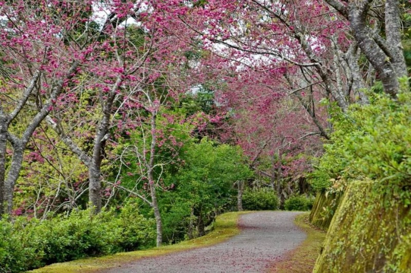 武陵農場的櫻花步道綿延 3 公里,一共種植了 2.1 萬株的櫻花樹,品種繁多高達十多種,並以「紅粉佳人」最甚,其花瓣密集迷人如同繡球花,是由日本昭和櫻與中國櫻桃雜交而產生的特有品種,春節期間一定要到武陵農場一探漫天盛開的粉色森林!