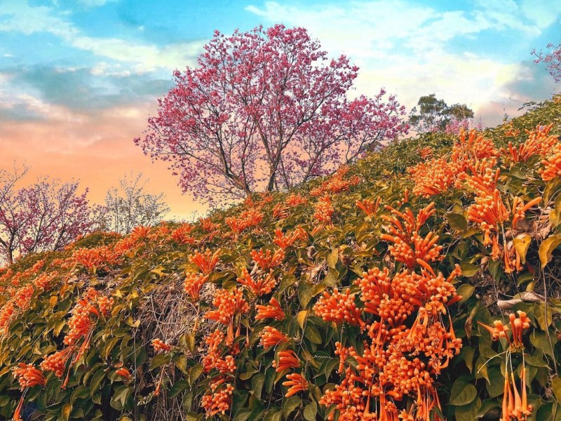 苗栗是炮仗花花海是新春必去的應景景點,而苗栗環保公園附近,不只有一面炮仗花牆和步道,最上層更是山櫻花小徑,二月至三月期間,可以看到炮仗花嶼山櫻花一起盛開的的美景,橘色瀑布與粉色櫻花相互輝映,不只喜氣也非常令人嘆為觀止!