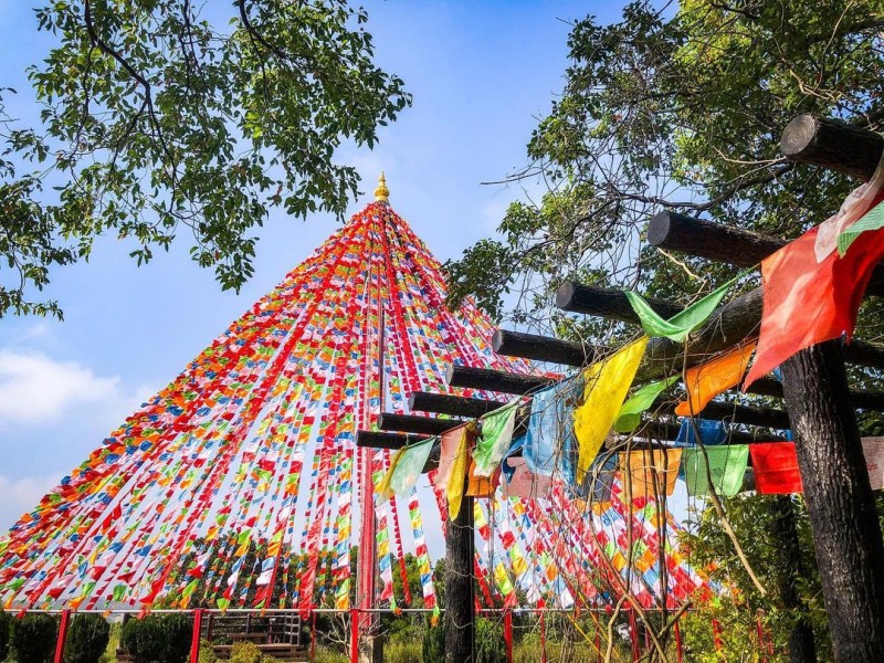 這個後龍景點,結合漢、藏、印的風格,加上為在遺世獨立的山上,真的給人置身國外的錯覺。目前還在籌備後續的建造是非常新的地方,裡面也有許多人在靜修,來此造訪請保持安靜,禁止穿著短裙、短褲來造訪。寺廟的圖騰、配色都很鮮豔,還有五彩的西藏風馬旗塔異國味十足。