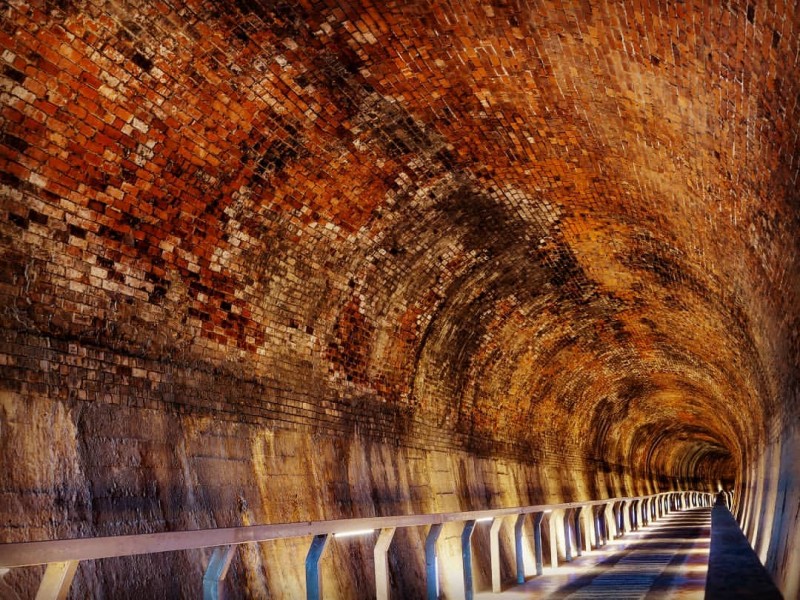 苗栗近兩年爆紅的竹南崎頂子母隧道、苗栗市功維敘隧道越來越多觀光客知道,而這座後龍過港隧道知名度還不高,沒有遊客人擠人走起來特別舒服。打上燈光的隧道,閃耀出黃金色的光澤非常夢幻,抬頭看還能看見紅磚砌成的隧道頂有黑色的痕跡,那是過去火車經過時被燻黑的印記。隧道平緩好走,是和親子旅行推嬰兒車也沒問題。