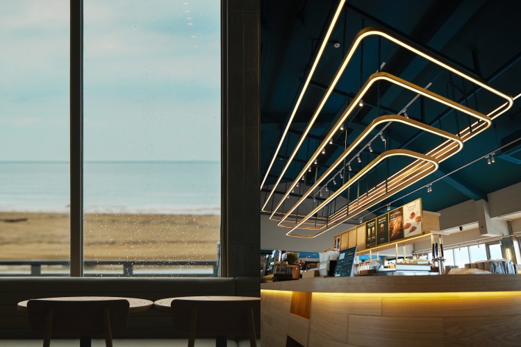 位在新北貢流「福隆觀海門市」門市內的主吧檯區則以中間特別挑高的設計,搭配層層的簡約弧形線條,設計運用左右兩側的垂降天花板,猶如坐臥在遊艇甲板,眺望無邊無際的海洋,特別裝飾以明亮漸層色系,更呼應了當地金色沙灘的美譽。搭配門市內靠窗區座位,如海洋波瀾的圓弧形靠背沙發,營造閒適而愜意的獨特體驗。