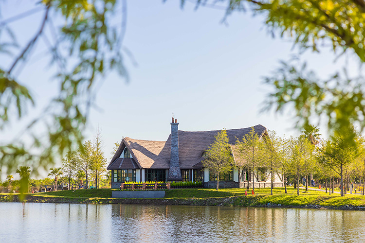 位在花蓮理想大地內的「花蓮理想門市」,外觀就像童話故事裡的夢幻小屋。門市建築整體線條採圓滑線、塔式及圓弧型而成,融合美式自由風格跟歐洲文化藝術,搭配落羽松四季變化與湖面倒影,讓人有種置身於童話夢幻之中的錯覺。門市內部設計以溫暖的中色階柚木色木皮、樸拙的六角地磚及冰柱玻璃,營造森林渡假屋氛圍,更在門市打造多扇開窗,讓顧客欣賞四周湖光山色自然美景,而以綠意色彩融合環境的掛畫凸顯童話故事景象。