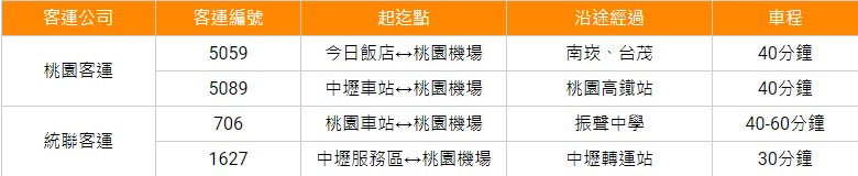 在桃園機場也有幾家開往不同目的地的客運公司,其中包含國光客運、統聯客運及大有巴士都有夜間服務